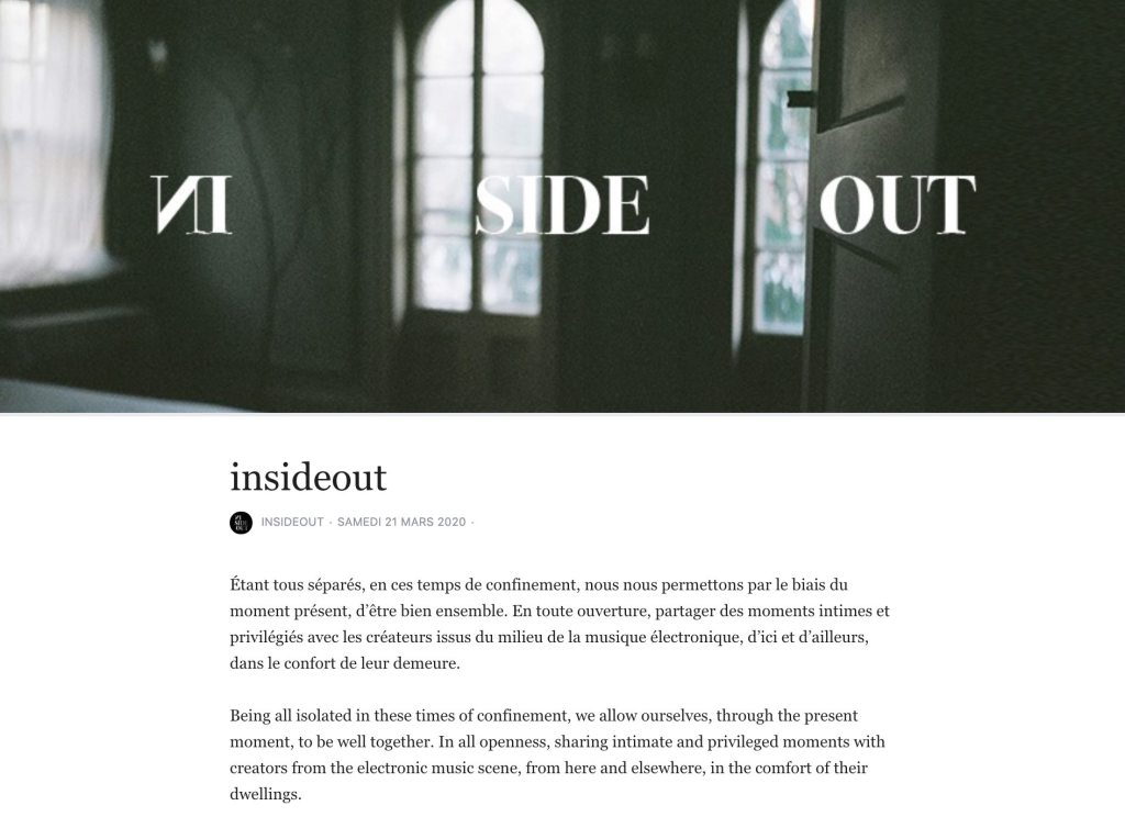 Né de l’envie d’être seul ensemble et de l’amour que nous avons pour la musique électronique, nous avons créé insideout, un espace de diffusion mettant de l’avant des compositeurs et des DJ’s par le biais du live streaming.